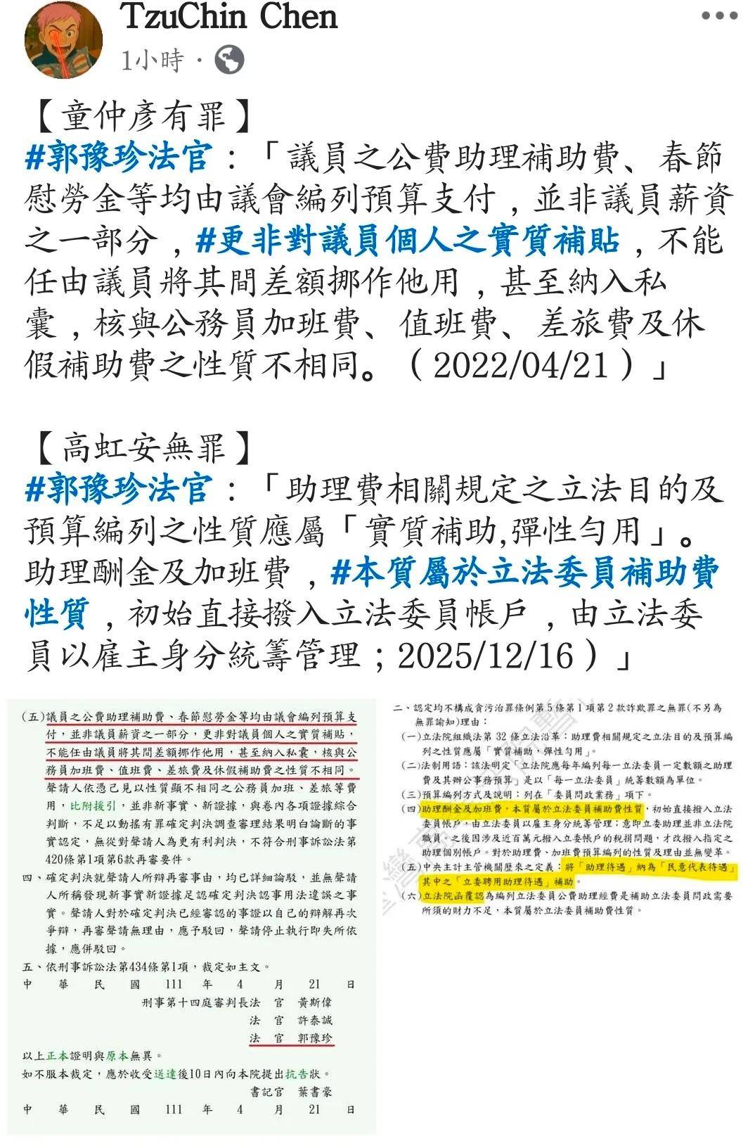 : 不是阿,同一個法官,同樣都是拿助理費,結果完全不同的判決。