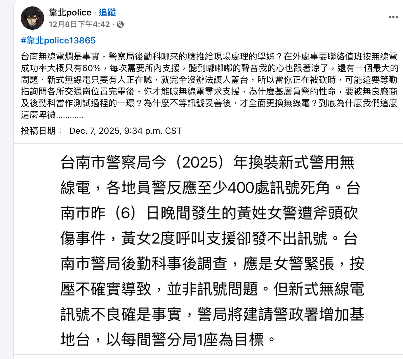 作者 usnavyseal (usmarine2008)標題 [新聞] 女警被砍求救竟失靈?台南換發警政署數位無線電爆死角多時間 Thu Dec 18 23:05:19 2025