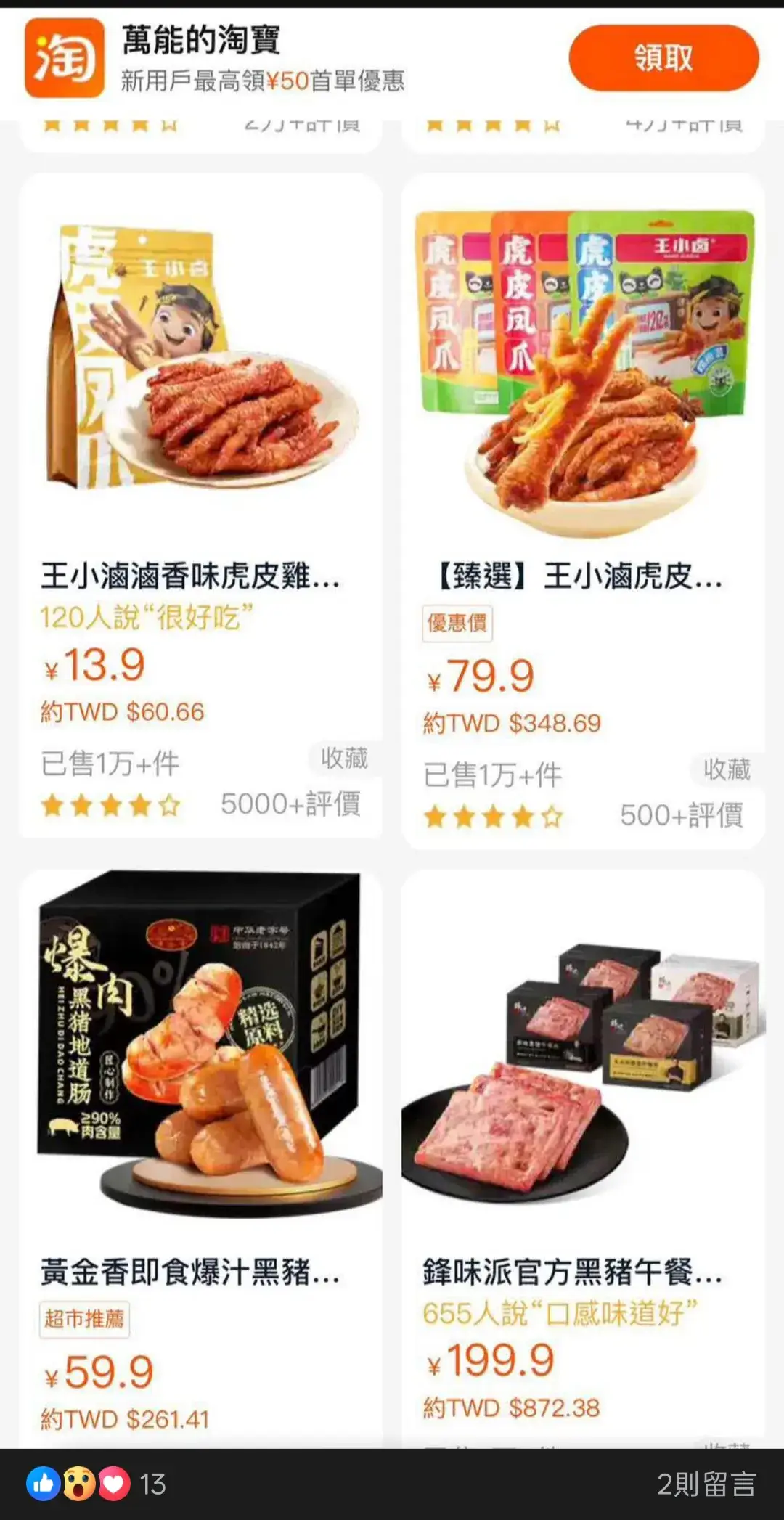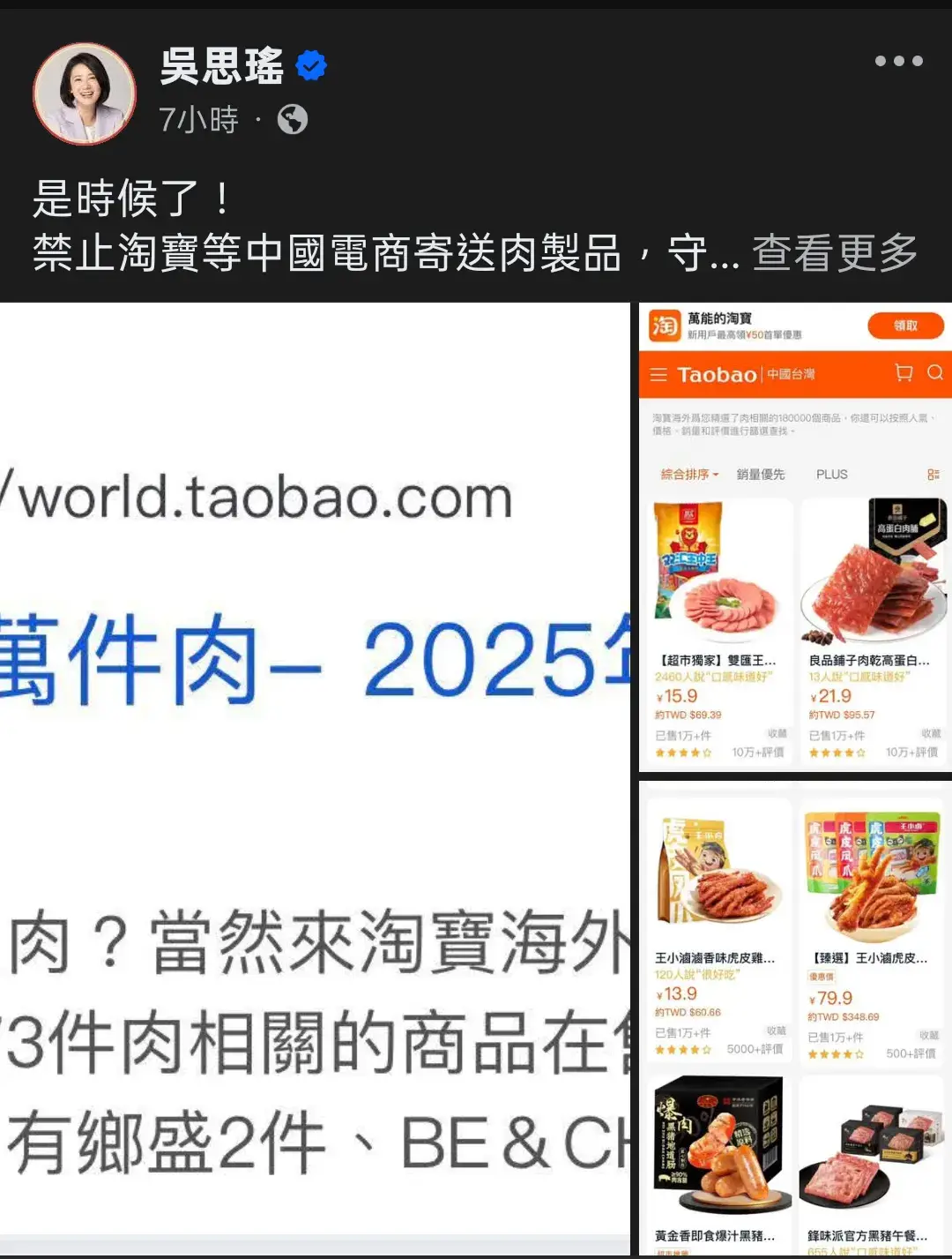 說個笑話,吳思瑤發文要求徹查從淘寶進入台灣的豬肉食品,然後示範的照片裡出現雞爪