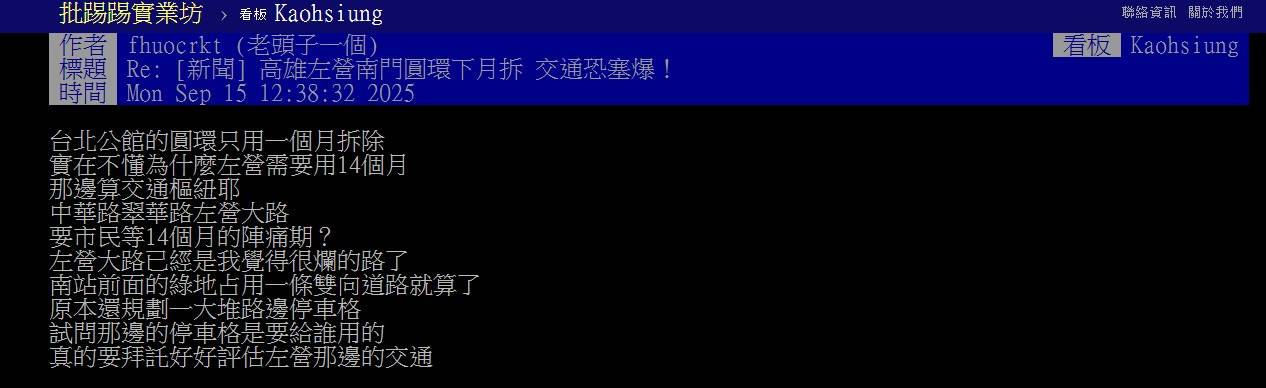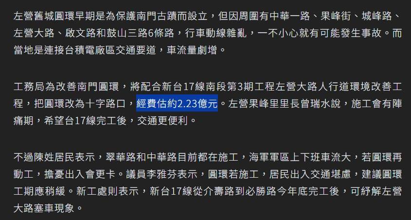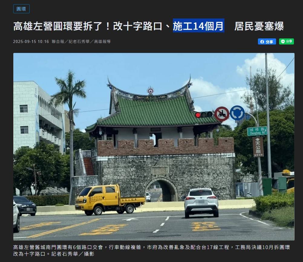 作者 HCYPMGO (黑白郎君)標題 [討論] 高雄左營圓環 花2.3億施工14個月?時間 Tue Sep 30 10:31:24 2025