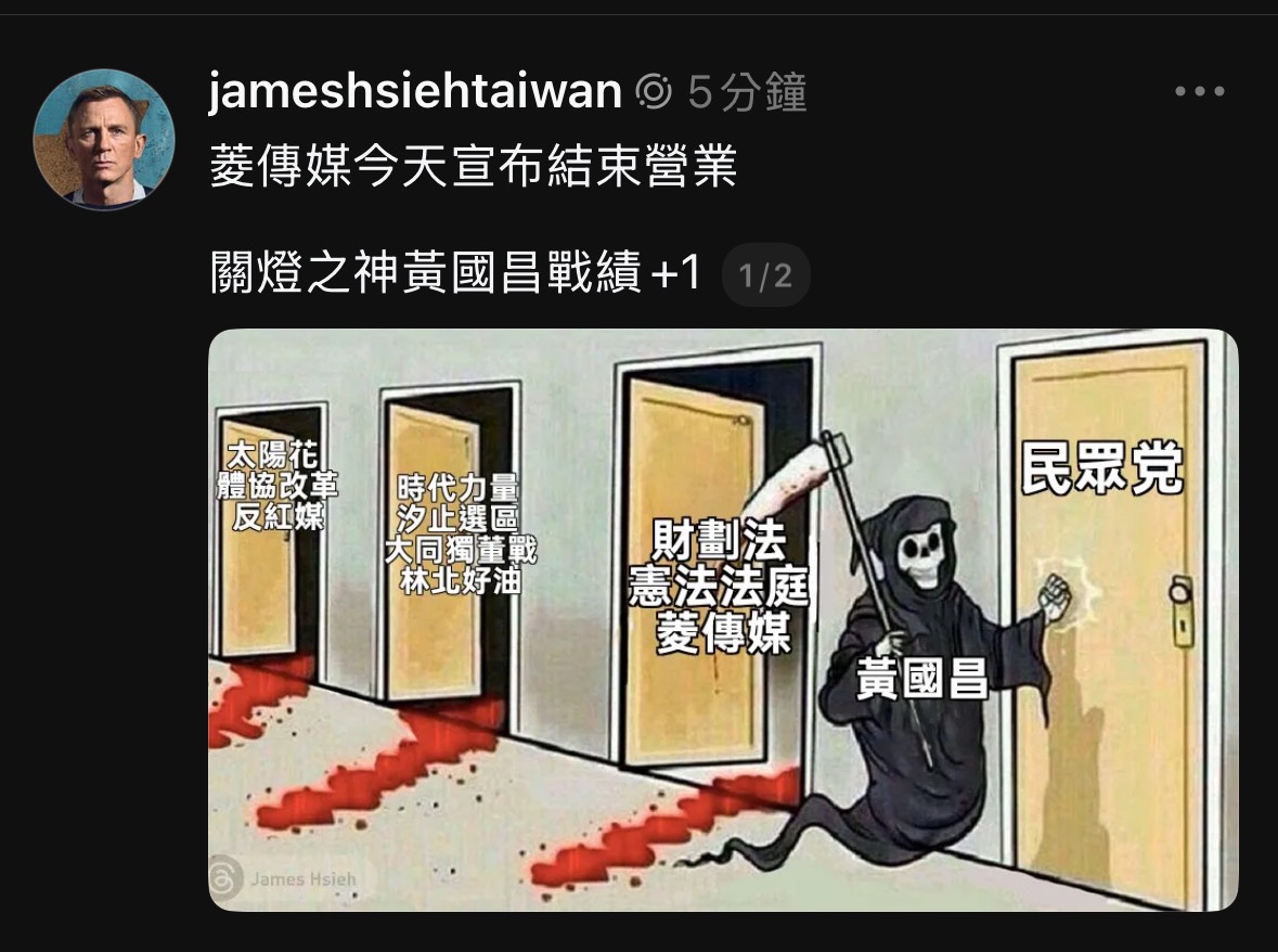 恭喜民眾黨主席狗仔昌黃國昌主席,又成功一例為媒體關燈了,看來阿北黨也在路程上了。