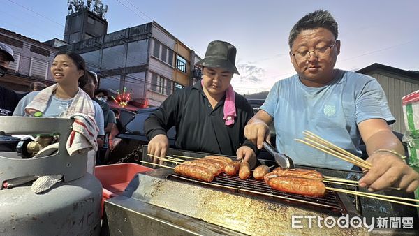 吳先生邊烤香腸邊笑說,他平時就有在斜槓擺香腸攤,這次來災區協助救災,因為鄰近中