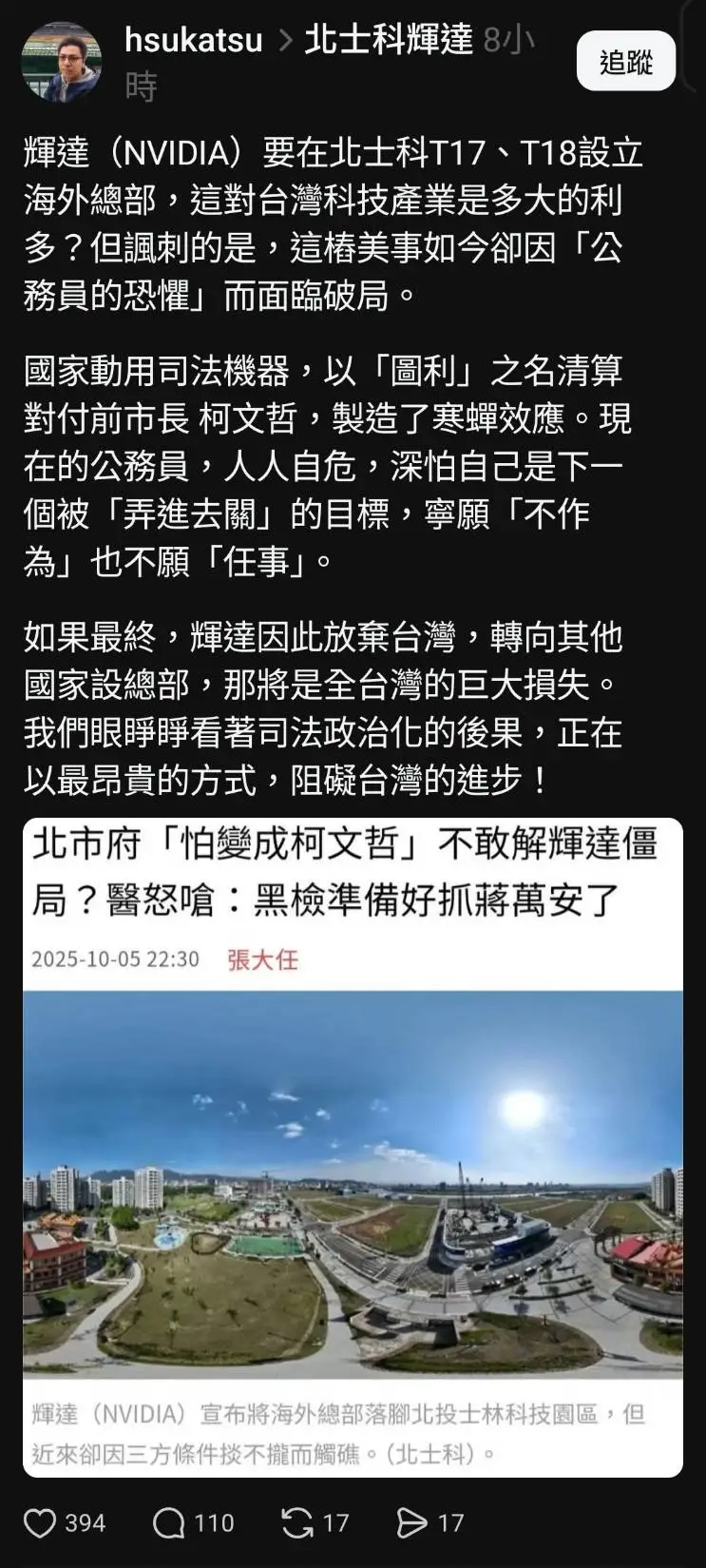 作者 hydra3179 (掉兩枚紙板)標題 [轉錄] 飛天麵條:黃仁勳在2026選舉前遭北檢起訴時間 Mon Oct 6 16:44:27 2025