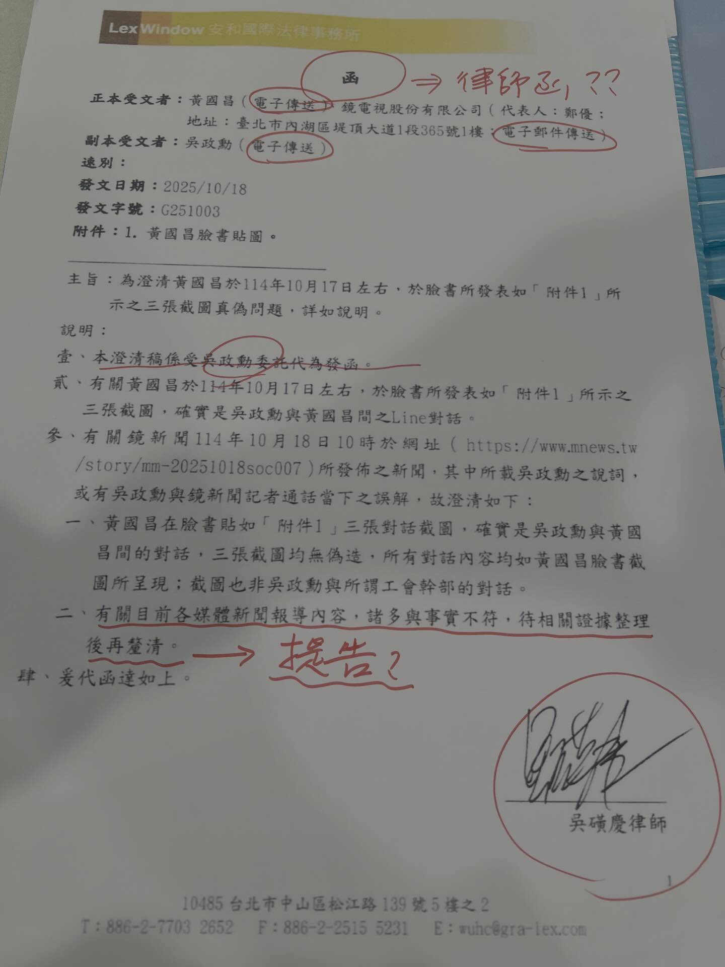 噓 copycat603: 這是吳男律師函 乾黃國昌屁事33F 36.231.166.250 台灣 10/21 11:11