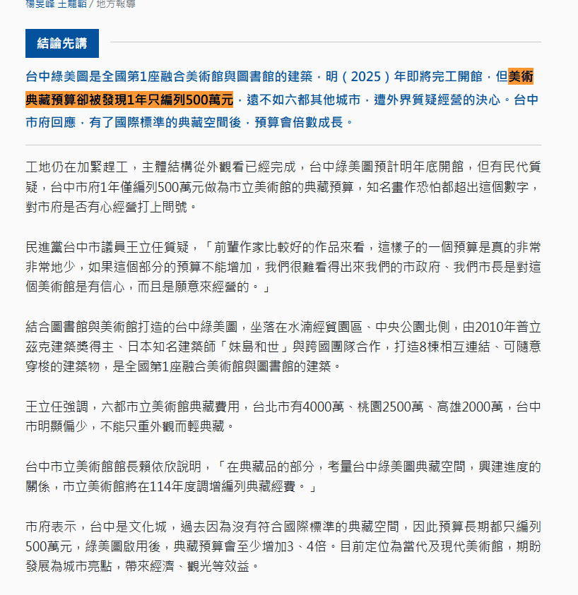 台中美圖啦 明年要開的那個 美術典藏預算只有500萬