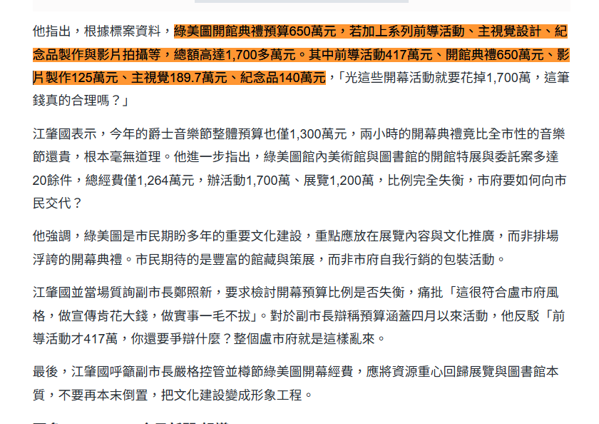 美圖開館典禮預算650萬元,若加上系列前導活動、主視覺設計、紀念品製作與影片拍攝
