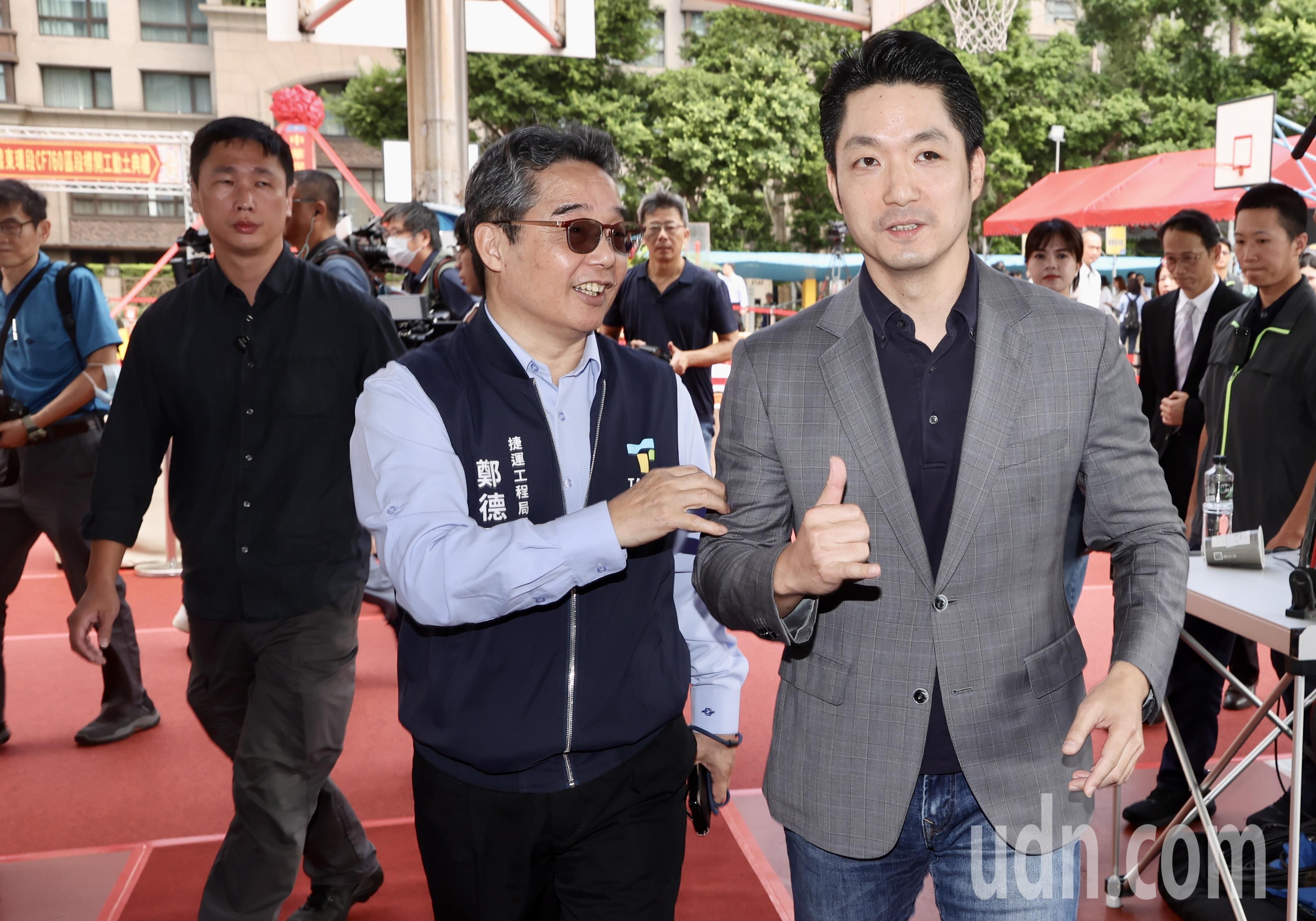 台北市長蔣萬安(右)今天上午在捷運工程局局長鄭德發(左)等陪同下,出席環狀線東