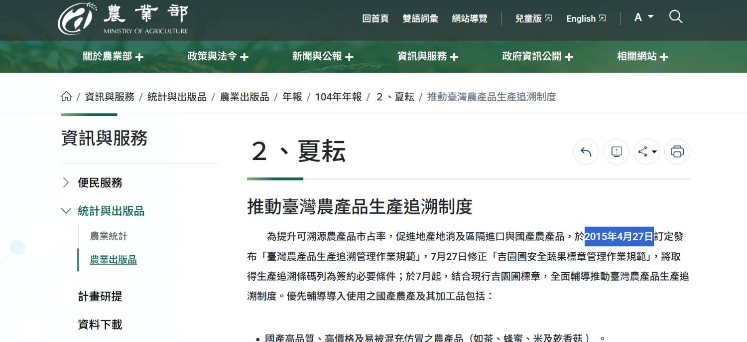 推動臺灣農產品生產追溯制度(農業部全球資訊網)