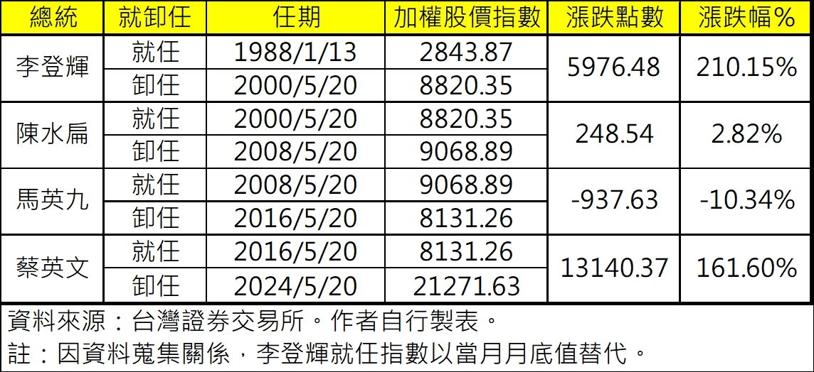 從數據看李登輝、陳水扁、馬英九、蔡英文四位歷任總統,他們在經濟上的表現分別如何呢?誰的任內股價漲最多?薪水成長最高?僑外投資最多?貧富差距最懸殊?讓我們由十個面向的圖表來詳細分析。 ...