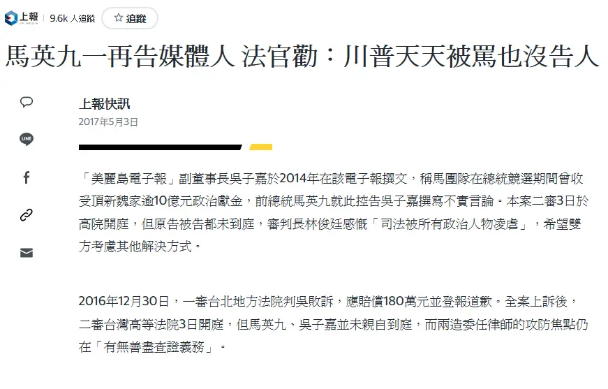馬英九一再告媒體人 法官勸川普也沒這樣4F 36.228.14.80 台灣 11/29 19:40
