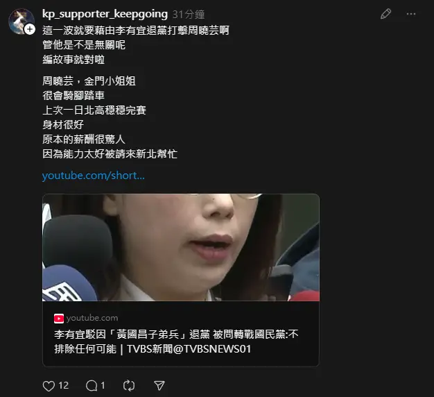 作者 Homura (德意志國防貓)標題 [新聞] 空降害李有宜退黨?周曉芸曝與黃國昌合時間 Mon Dec 1 11:10:07 2025