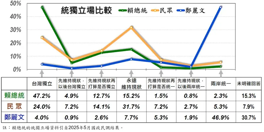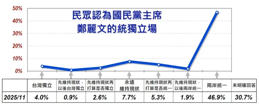 : 民眾認為鄭麗文的統獨立場 46.9%回答兩岸統一 壓倒性最多