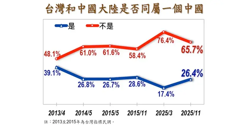 : 兩岸是否同屬一個中國 認為是的17.4%>26.4%