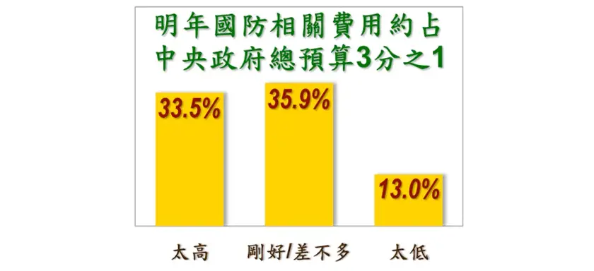 : 國防佔總預算三分之一 太高33.5% 剛好/差不多35.9% 太低13.0%
