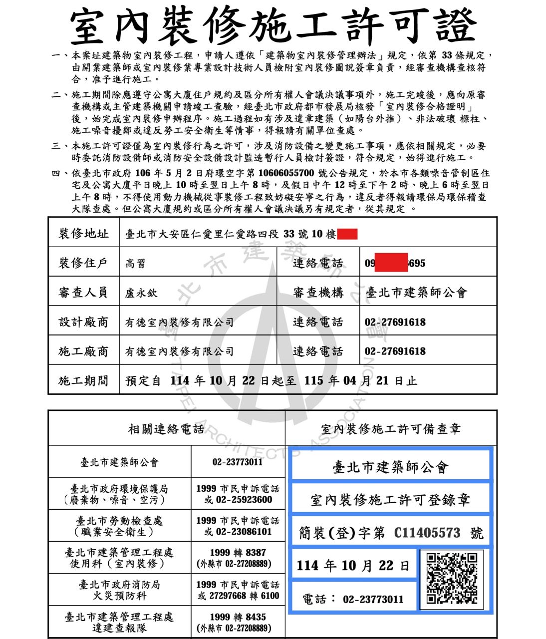 雖然施工許可證是公開資料,但我還是稍微幫她遮一下,