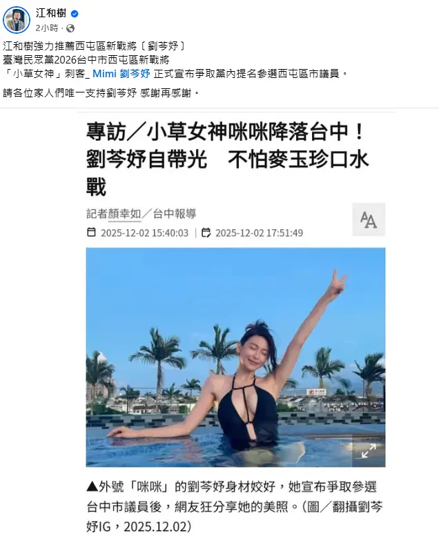 [討論] 江和樹推薦新戰將「劉芩妤」 大大大大 - HatePolitics 板