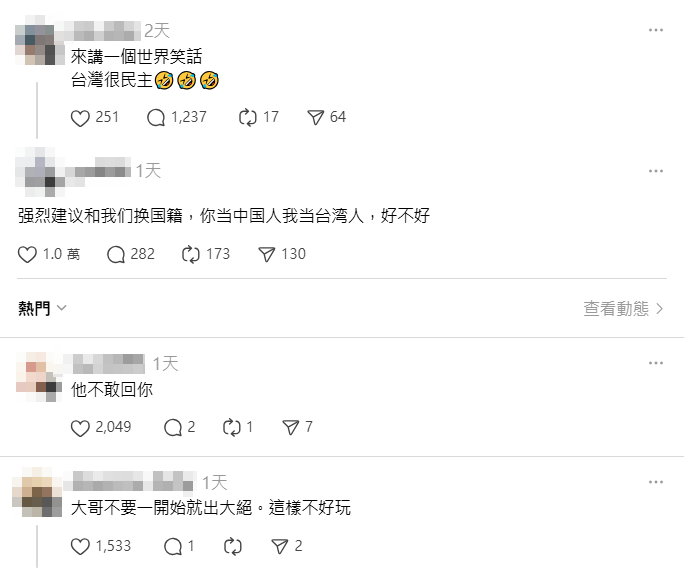 台灣民主就是個笑話,結果釣出中國網友神回「建議和我們換國籍」,讓該名藍白粉秒閉嘴