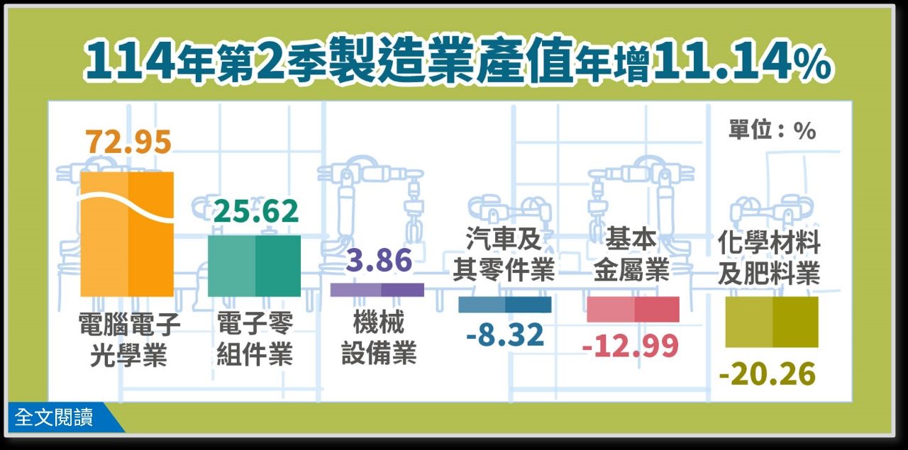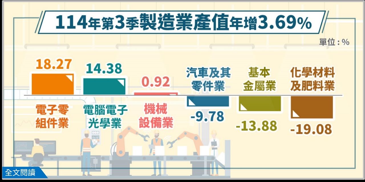 至於其它產業的衰退,全部被電子相關產業成長的榮景掩蓋了,比如今天前三季的製造業