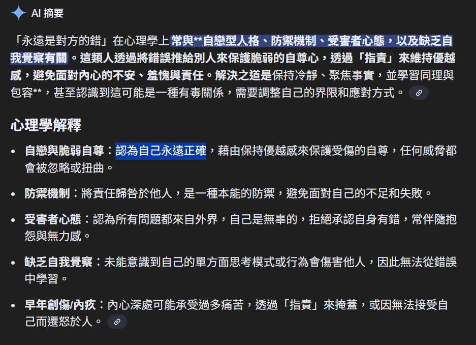 認為自己永遠正確,藉由保持優越感來保護受傷的自尊,任何威脅都會