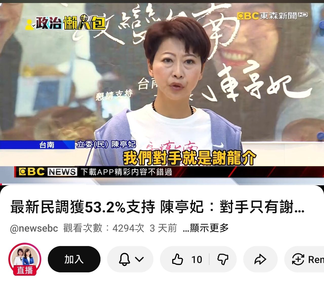 最新民調,陳亭妃的仍以過半數53.2%的支持度領先