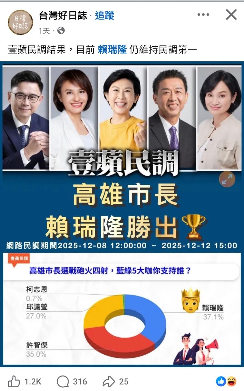 FB看到的,壹蘋網路民調,賴瑞隆37%,許智傑35%,邱議瑩27%,國民黨柯志恩只有0.7%