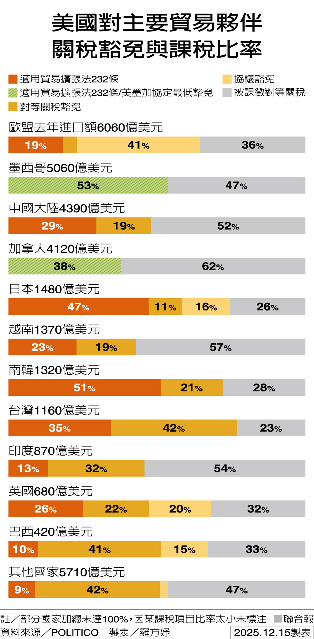 根據POLITICO提供的數據,台灣出口美國商品僅百分之廿三被課徵對等關稅,是美國主要