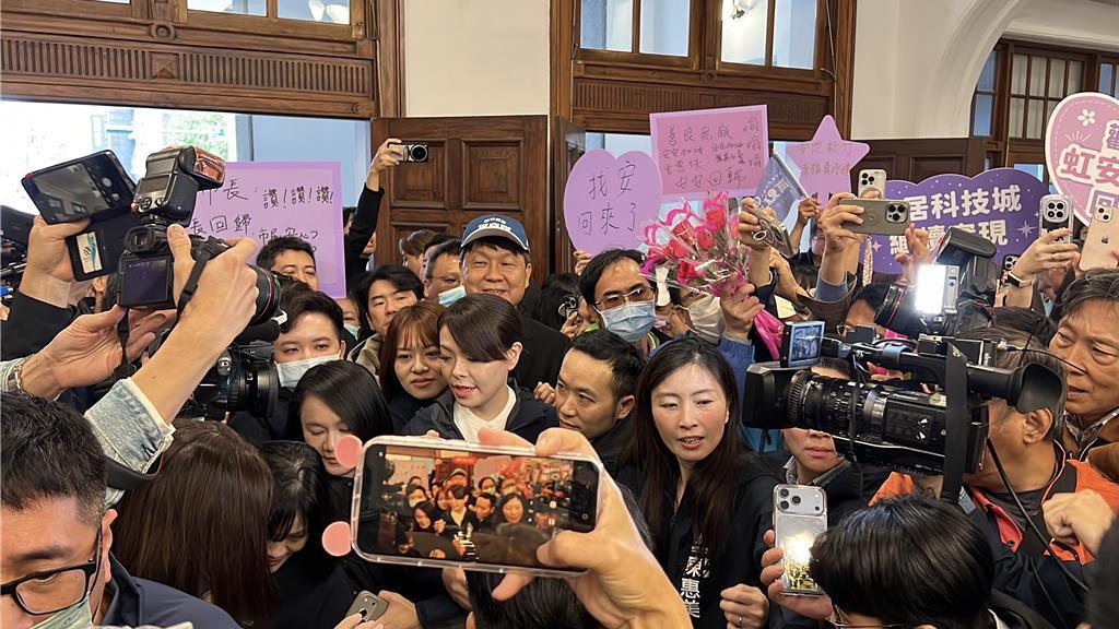 新竹市長高虹安18日上午8點30分,返回新竹市政府復職,支持者擠爆市府大廳外夾道歡