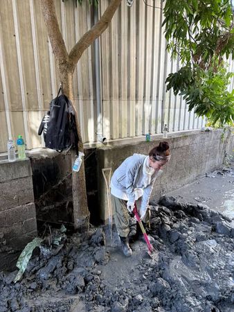 李多慧素顏現身花蓮救災,加入「鏟子超人」行列,照片中她在泥濘中挖土,雖然辛苦