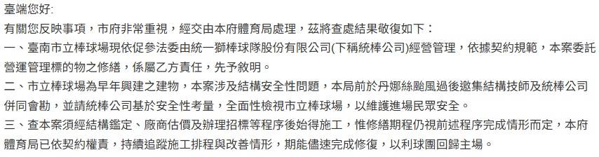 確釐清維修權責歸屬,不能讓球迷陷入嚴重的資訊落差,而這也會對市府和球團造成傷害。