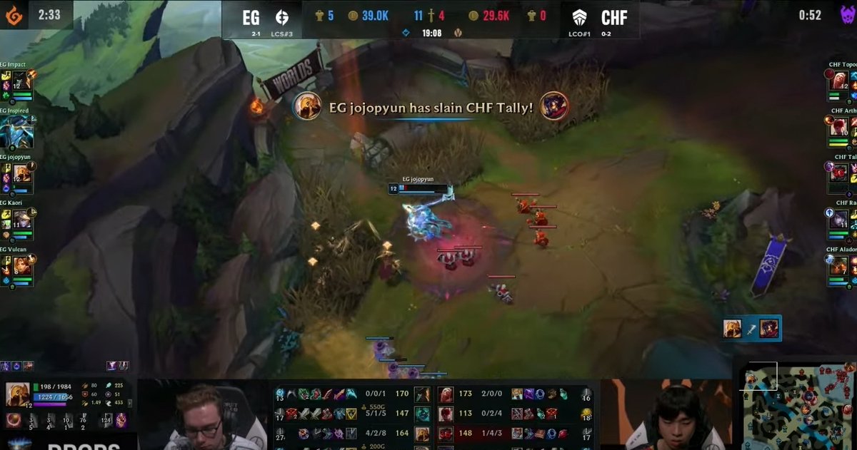 在剛剛 EG 對上 CHF 的比賽中,jojopyun 的阿祈爾在比賽時間 19:08 時於上路單殺了