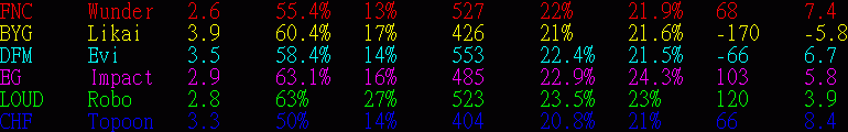 反正接下來寫隊伍介紹的時候也要找資料,不如就一起貼上來分享給大家~~~ 數據來源:Oracleselixir,數據統計於各賽區的季後賽 名詞解釋:KP%=參團率;FB%=首殺率;DPM=分均傷;DMG …