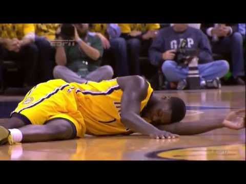 事件發生在溜馬熱火系列賽第二場第三節還剩3:39秒時,舞王在追防LBJ的時候摔倒,然