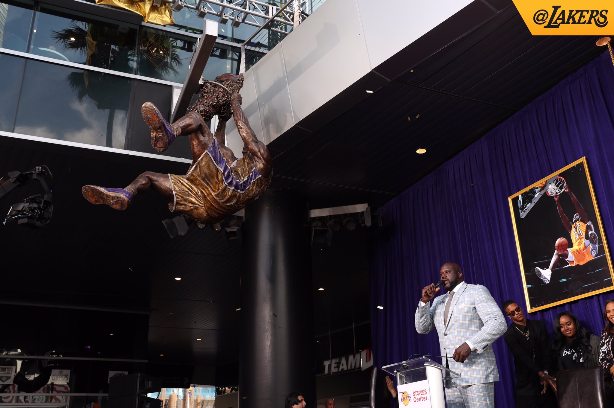 磯湖人隊美國當地時間週五在斯台普斯中心外的O'Neal雕像揭幕儀式。