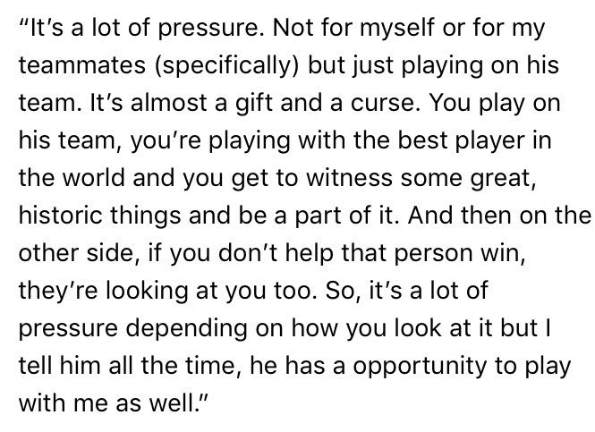 “有很多壓力。不是對我或者我的隊友們,而是在他所在的球隊打球。和他在一起打球可