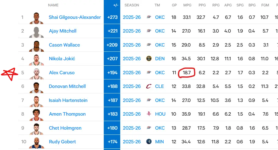 : 以上場時間的效率來說,卡魯獸+/-全聯盟第一