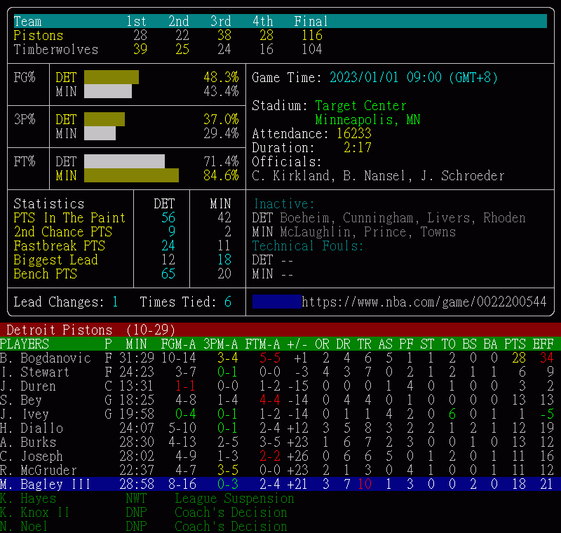 ╭╮ │Team 1st 2nd 3rd 4th Final │ │Pistons 28 22 38 28 116 │ │Timberwolves 39 25 24 16 104 │ ├──┬┬┤ │ …