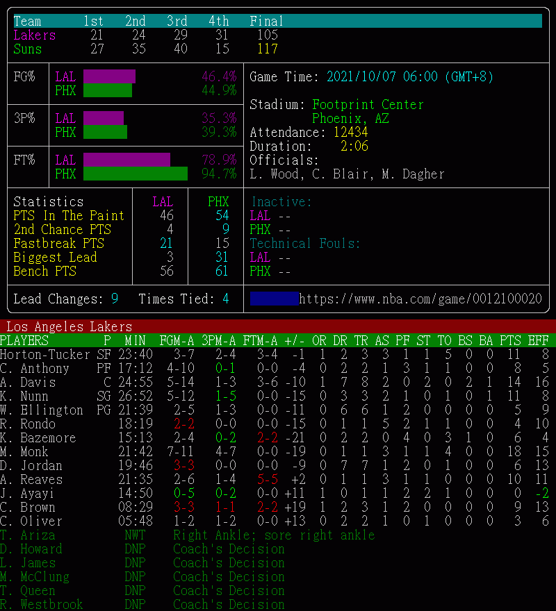 [BOX ] Lakers 105:117 Suns (Preseason)