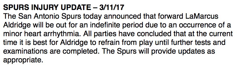 消息來源: 內容:LaMarcus Aldridge will be out for an indefinite period due to an occurrence of a minor hear …