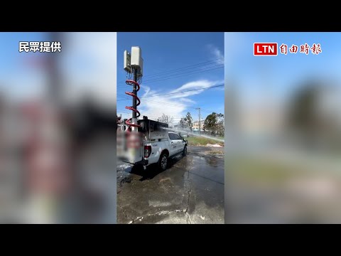 台南市消防局獲報後,調派鹽水消防分隊前往灌救,起火點疑在載有行動基地台的車子後