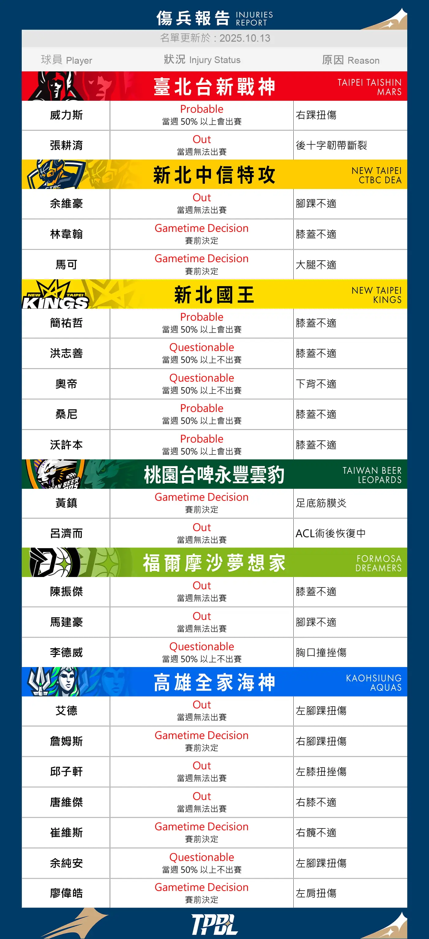 [情報] 2025.10.13 TPBL傷兵報告 - basketballTW 板