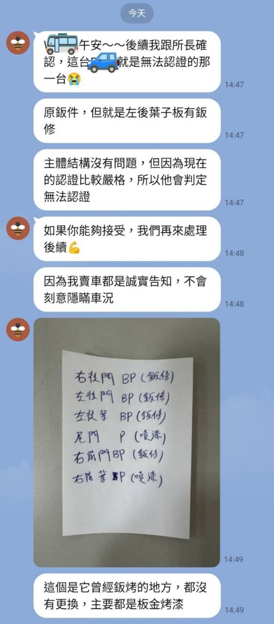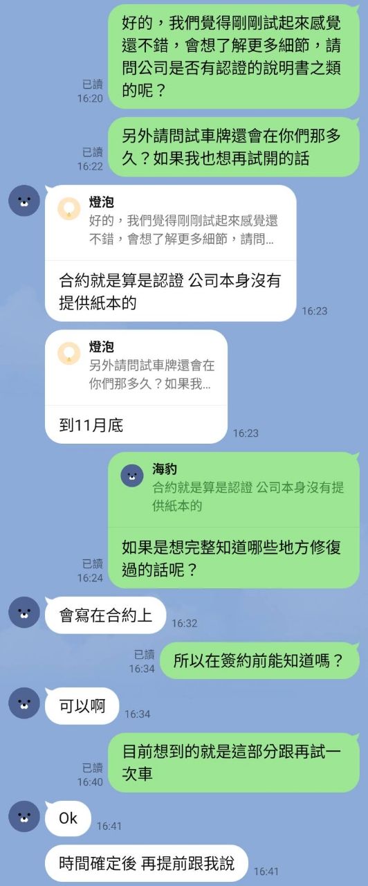果試完車覺得不錯,業務說車子目前外觀有點瑕疵以及有部份修復過,現況交車的話可以