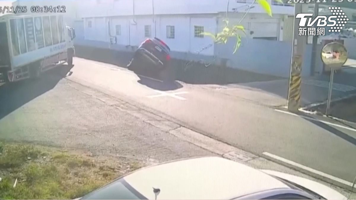 就向下栽落,整輛車還往右翻覆,四輪朝天。路過的機車騎士非常熱心,立即下車上前查